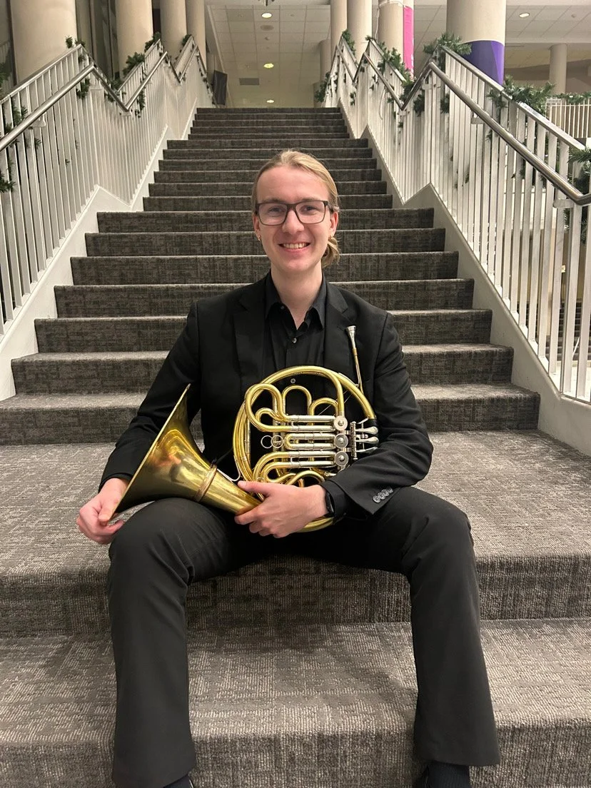 Adept and avid in performing, educating, and arranging, Patrick Mooney is a fourth-year undergraduate student at the University of Northern Iowa studying instrumental music education and horn performance with Assistant Professor of Instruction in Horn, Dr. Maddy Tarantelli.